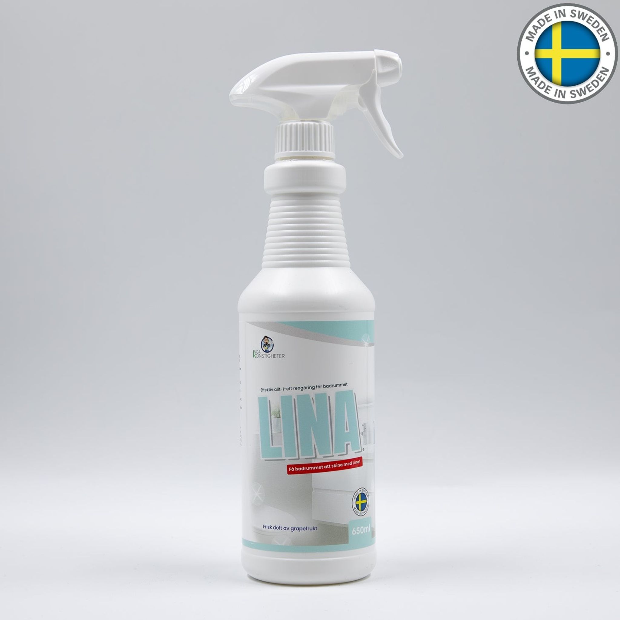 LINA är ett högpresterande rengöringsmedel för badrumsrengöring, utvecklat för att hålla hela badrummet fräscht och rent. Produkten tar effektivt bort kalk, tvålrester och ingrodd smuts från handfat, kranar, badkar, toalett, duschväggar, kakel, akryl och glasytor. Formulan är kraftfull mot beläggningar men skonsam mot ytor, hemmet och miljön, och lämnar en frisk doft av grapefrukt.