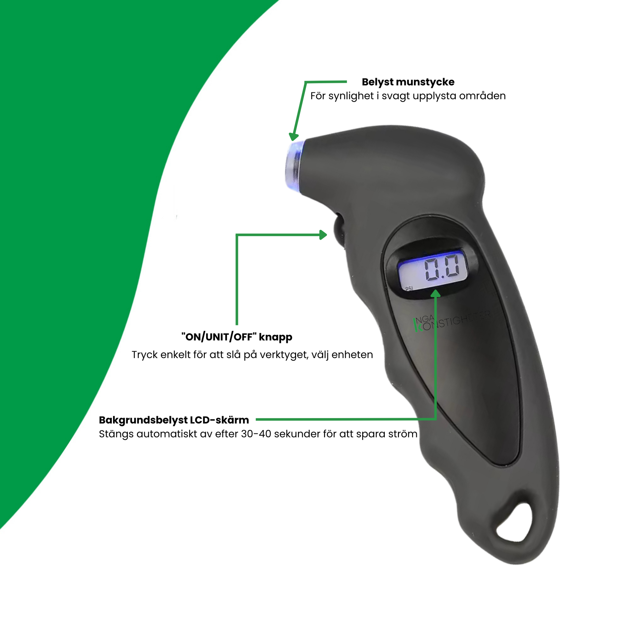 - LCD Läsning: Den tydliga 1/4" LCD-skärmen ger en snabb och lättläst tryckavläsning.